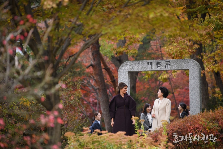 국빈방문한 멜라니아 트럼프 여사가 7일 오후 청와대를 방문해 김정숙 여사와 산책하고 있다.