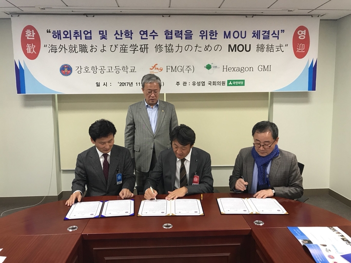 유성엽 국회 교육문화체육관광위원장(국민의당, 정읍·고창)은 전북 고창 강호항공고등학교와 ㈜FMG, 헥사곤지엠아이(주) 간 업무협약(MOU)을 체결했다고 8일 밝혔다.
