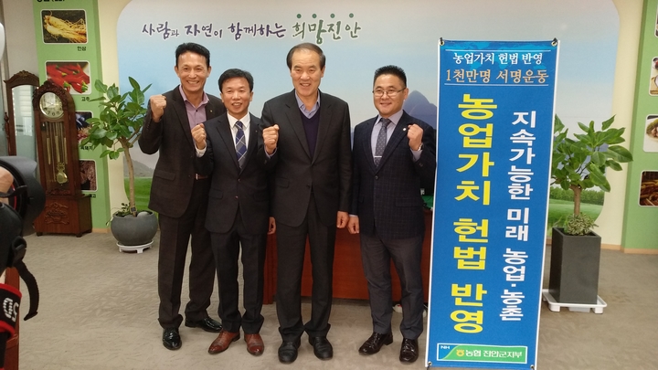 NH농협 진안군지부는 농업의 공익적 가치의 식량안보, 농촌경관 및 환경보전, 수자원 확보 및 홍수방지, 지역사회 유지, 전통문화 계승 등 다양한 공익적 역할을 수행하는 기능이 헌법에 반영돼 지속 가능한 농업 발전의 원동력이 될 수 있도록 하는 ‘농업가치 헌법반영 서명 운동’을 각종 행사에서 방문 고객들을 대상으로 전개하고 있다.