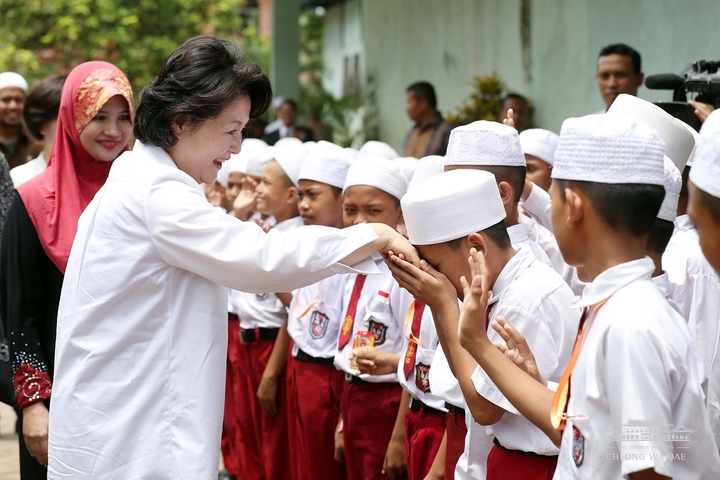 김정숙 여사가 9일 오전 인도네시아 보고르시에 있는 알 아쉬리야 누룰 이만 이슬람 기숙학교를 방문해 태권도단 학생들과 즐거운 시간을 보내고 있다.