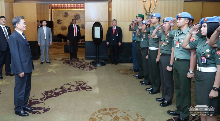 인도네시아를 방문 중인 문재인 대통령이 9일 인도네시아 경호사령부 소속 경호원들을 만나 격려하고 있다.