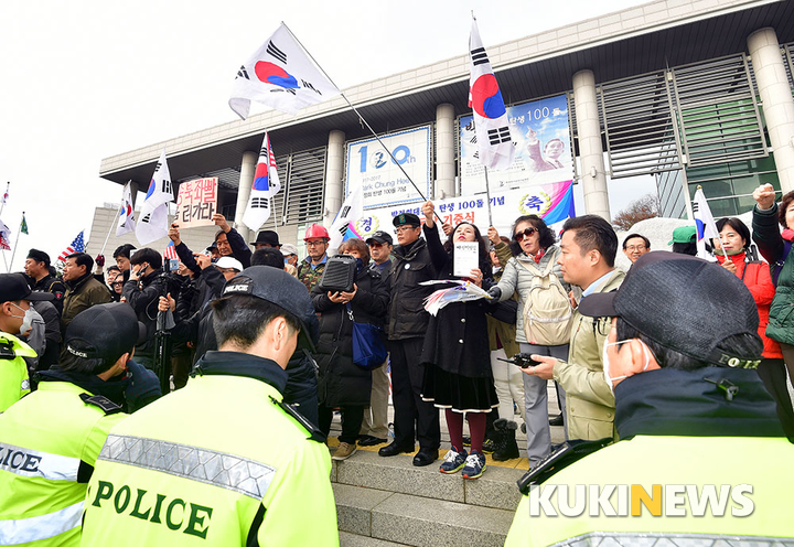 13일 서울 마포구 박정희대통령기념관에서 열린 박정희 동상 기증식에서 이승만·트루먼·박정희 동상건립추진모임 회원이 반대 단체를 향해 구호를 외치고 있다.