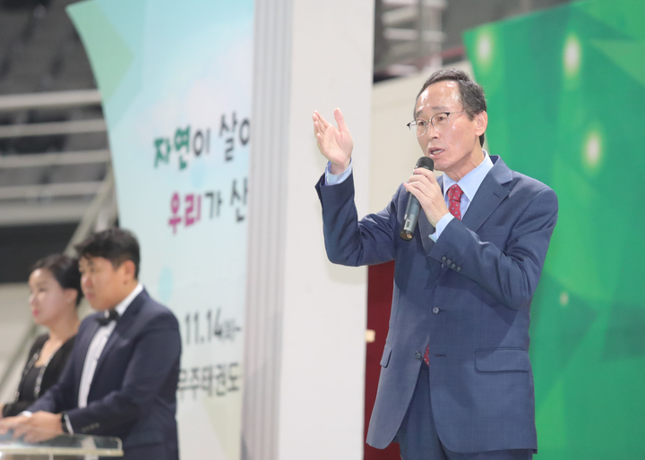 이날 이재윤 자연보호중앙연맹 총재, 송하진 도지사, 황정수 무주군수,정창수 전북협회장 등을 비롯해 850여명의 회원들이 참석한 가운데 송하진 도지사가 특별강연을 하고 있다.