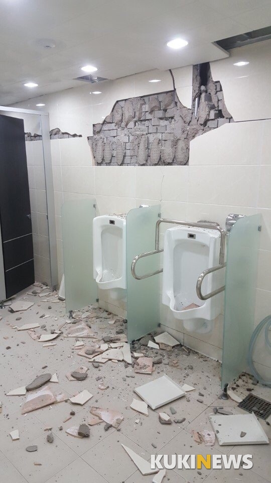 15일 오후 경북 포항시 한동대학교의 화장실 내부 타일이 지진으로 떨어졌다.