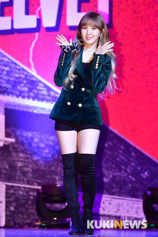 걸그룹 레드벨벳(웬디, 슬기, 아이린, 예리, 조이) 웬디가 16일 오후 서울 삼성동 SM타운 코엑스 아티움에서 열린 정규 2집 '퍼펙트 벨벳(Perfect Velvet)' 발매 기념 공연에서 포즈를 취하고 있다.