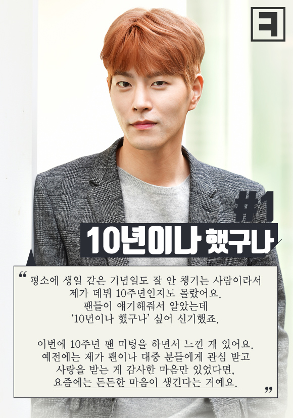 “평소에 생일 같은 기념일도 잘 안 챙기는 사람이라서 제가 데뷔 10주년인지도 몰랐어요. 팬들이 얘기해줘서 알았는데 ‘10년이나 했구나’ 싶어 신기했죠. 이번에 10주년 팬 미팅을 하면서 느낀 게 있어요. 예전에는 제가 팬이나 대중 분들에게 관심 받고 사랑을 받는 게 감사한 마음만 있었다면, 요즘에는 든든한 마음이 생긴다는 거예요.”