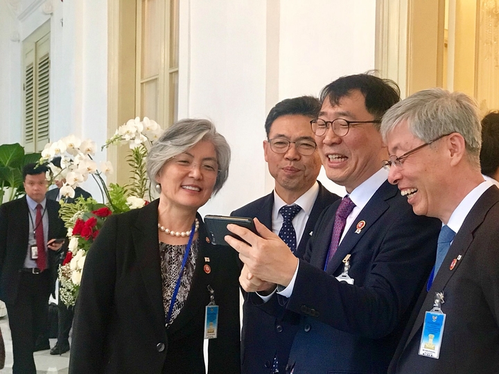 강경화 외교부 장관과 홍장표 경제수석, 윤양찬 수석, 김현철 경제보자관이 웃으며 휴대폰 속 사진을 감상하고 있다.