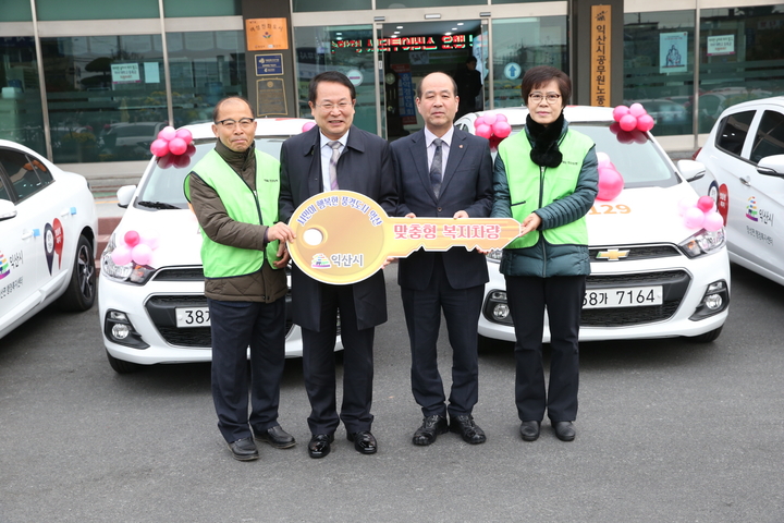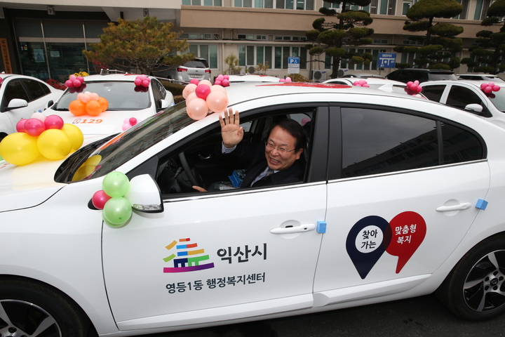 익산시는 익산시청 광장에서 29개 읍‧면‧동행정복지 센터에 찾아가는 복지서비스의 적극 추진을 위한 총 29대의 차량(전기차 20대와 가솔린 9대) 전달식을 22일 가졌다.