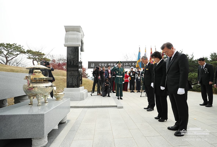 문재인 대통령과 김정숙 여사가 22일 오후 서울 동작구 국립현충원 故 김영삼 대통령의 묘역에 참배하고 있다.