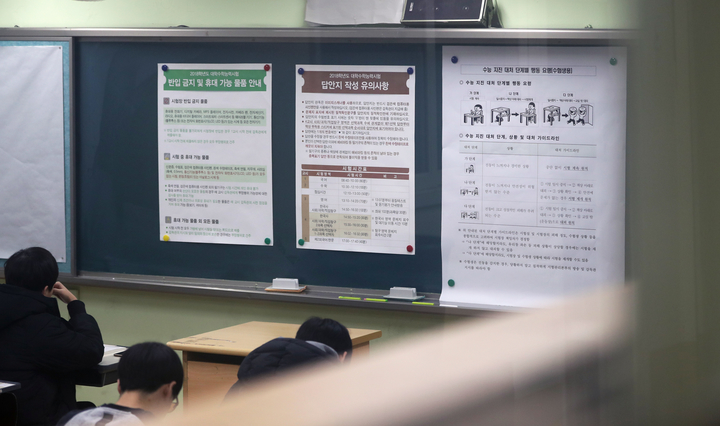 2018학년도 대학수학능력시험이 열리는 23일 오전 서울 서초고등학교 고사장 칠판에 지진대피안내문이 붙어 있다.