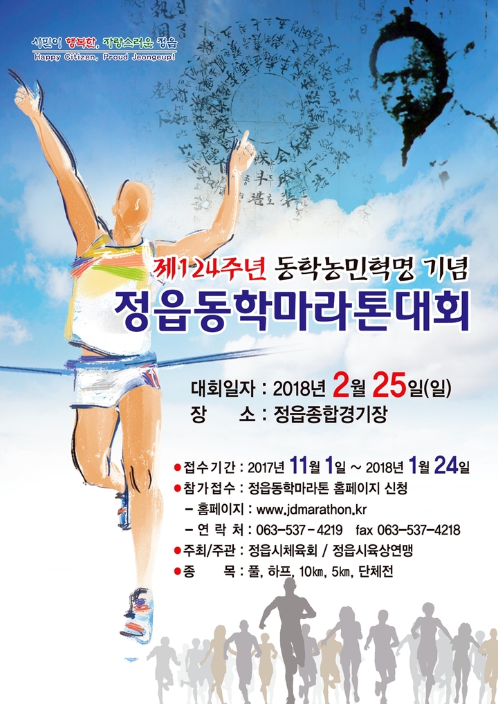정읍시체육회와 정읍시육상연맹이 주최·주관하는 ‘제124주년 동학농민혁명기념 정읍 동학마라톤대회’가 2018년 2월 25일 정읍종합경기장에서 열린다.