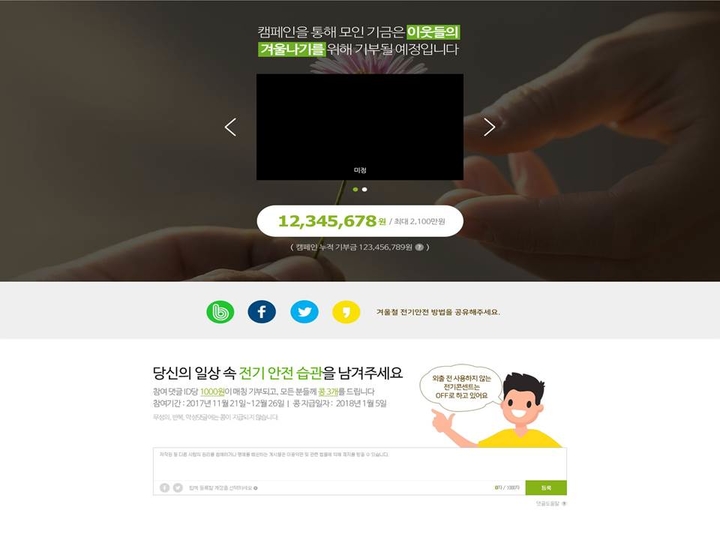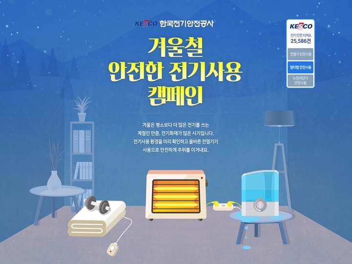 한국전기안전공사는 지난 21일부터 12월 26일까지 한 달여 동안 네이버 기부포털 ‘해피빈’과 더불어 ‘겨울철 안전한 전기사용 캠페인'을 진행한다.