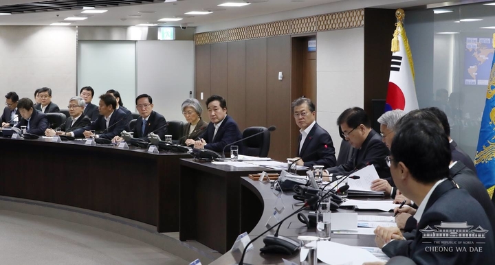 문재인 대통령이 29일 새벽 북한이 동해상으로 탄도미사일 1발을 발사한 것과 관련해 청와대 국가 위기관리센터 상황실에서 NSC(국가안전보장회의) 전체회의를 주재하고 있다.