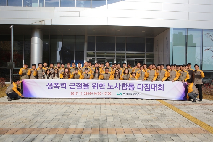 전북혁신도시 내 LX 본사 임원을 포함한 실·처장, 부설기관장과 실장, 지역 본부장과 처장, 전국 각 지사장, 노동조합 간부 등 250명의 관리자들이 모여 ‘성 폭력 근절을 위한 노사합동 다짐대회’를 29일 열었다.