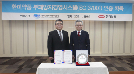한미약품은 올해 하반기부터 ISO 37001 인증 획득을 위한 전사적 준비를 시작했으며, 내∙외부 부패유형 파악, 내부심사원 육성, 부패방지 방침 선포, 부패방지 목표 수립, 자율준수관리자 중심의 부패방지 관리 시스템 등을 구축하고 강도높은 성과평가를 실시했다.