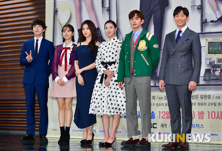 배우 엄기준과 박세완, 황승언, 채수빈, 유승호, 강기영(왼쪽 사진부터)이 4일 오후 서울 상암동 MBC에서 열린 수목미니시리즈 '로봇이 아니야' 제작발표회에 참석해 포즈를 취하고 있다.