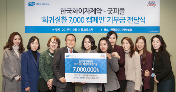 한국화이자제약(대표이사 사장 오동욱)은 희귀질환 환자들을 응원하기 위해 진행했던 ‘희귀질환 7000캠페인’을 마치고 지난 11일 조성된 기부금을 국제구호개발 NGO 굿피플(회장 김천수)에 전달했다고 밝혔다.