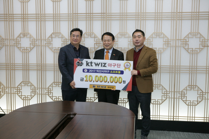 전북 익산시는 KT wiz 야구단이 익산시청 시장실을 찾아 1,000만원 상당의 야구 후원용품을 기탁했다고 13일 밝혔다.