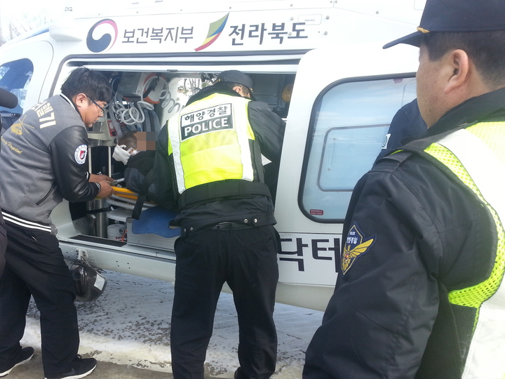 부안해경은 13일 오전 11시 24분경 부안군 위도면 식도에서 그물정리 작업중 그물위에서 떨어져 뒷머리를 다친 환자가 있다는 신고를 받고 위도파출소 경찰관, 경비함정, 민간해양구조선, 닥터 헬기를 현장에 급파했다고 전했다.
