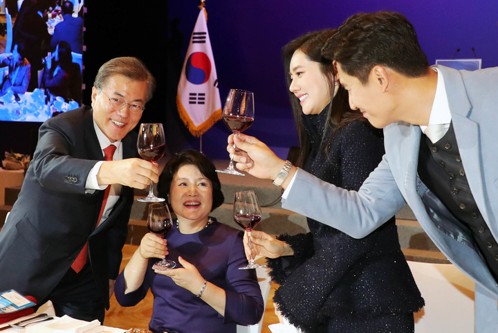 문재인 대통령과 부인 김정숙 여사가 13일 오후 중국 국빈방문 첫 일정으로 베이징에 위치한 완다 소피텔 호텔에서 열린 재중국 한국인 오찬 간담회에서 배우 추자현, 우효광 부부와 건배하고 있다.