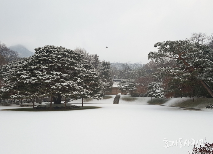 서울을 비롯한 중부지방에 많은 눈이 내린 10일 오전 청와대가 하얀 눈으로 뒤덮여 있다.