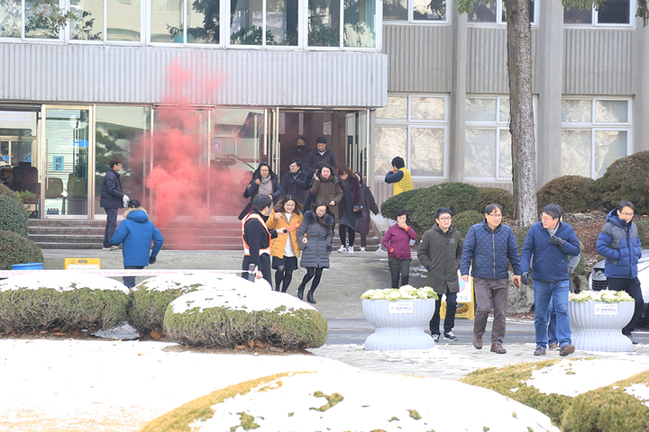 이날 훈련은 대학본부에 상주하는 전체 교직원과 학생지원관 및 생활과학대학에서 수업 중인 학생 등 300여 명이 참가한 가운데 초기 지진 발생부터 대피, 화재진압, 안전교육, 강평 등 30여 분간 진행됐다.