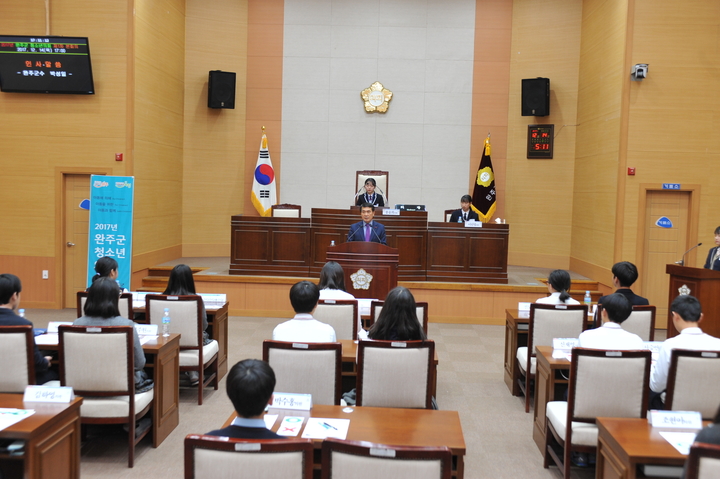 전북 완주군은 지난 14일 봉송희 의장(봉서중·3)의 개회 선언을 시작으로 완주군의회 본 회의장에서 ‘2017 완주군 청소년의회 본 회의’를 열었다고 15일 밝혔다.