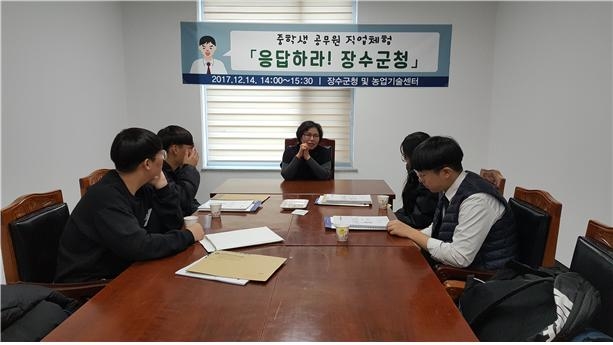 전북 장수군은 지난 14일 관내 중학교 2, 3학년 학생을 대상으로 중학생 직업체험 프로그램 ‘응답하라! 장수군청’, 주제로 견학 및 체험을 실시했다고 15일 밝혔다.