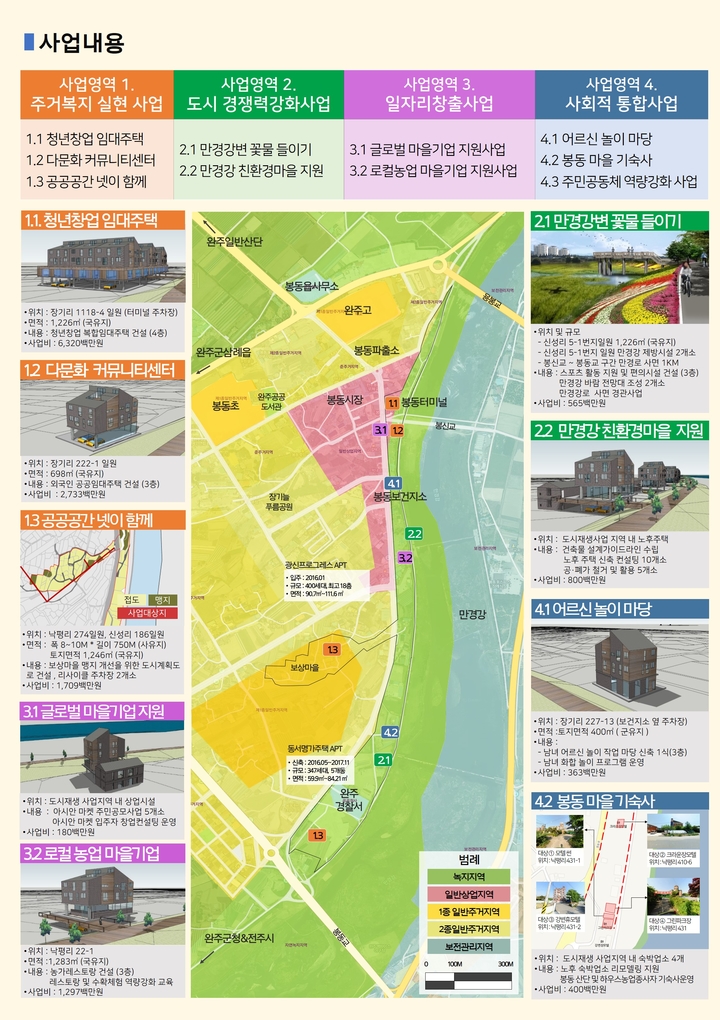 세부사업은▲청년창업 임대주택 ▲다문화 커뮤니티센터 조성으로 주거 복지를 실현하고 ▲만경강변 꽃물들이기 ▲만경강 친환경마을 조성 등이며, 지역특화를 통해 도시 경쟁력을 높인다는 방안이다.
