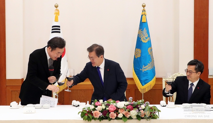 문재인 대통령이 26일 청와대에서 열린 '국무회의 구성원 초청 만찬'에서 이낙연 총리와 건배하고 있다.