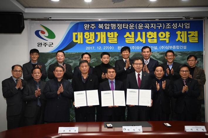 완주군은 복합행정 타운을 추진할 대행개발 사업자로 ㈜모아종합건설, ㈜삼부종합건설 컨소시엄을 선정하고 협약을 체결했다고 27일 밝혔다. 앞으로 두 회사는 복합행정타운 공사 전반을 맡게 된다.
