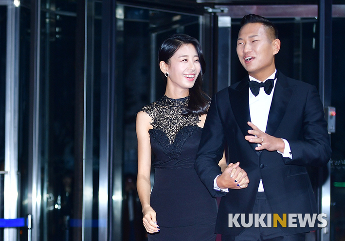 정대세, 명서현 커플이 30일 오후 서울 마포구 SBS프리즘센터에서 열린 '2017 SBS 연예대상' 레드카펫 행사에 참석해 포즈를 취하고 있다.