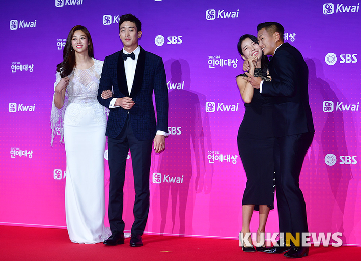 강경준, 장신영 커플과 정대세, 명서현 커플이 30일 오후 서울 마포구 SBS프리즘센터에서 열린 '2017 SBS 연예대상' 레드카펫 행사에 참석해 포즈를 취하고 있다.