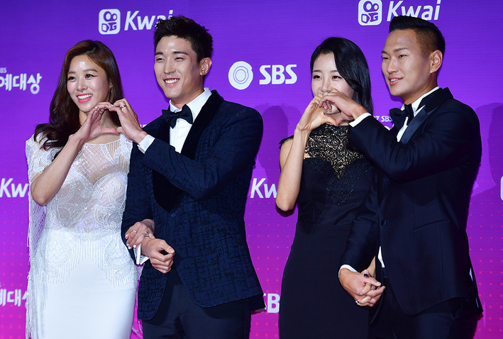 강경준, 장신영 커플과 정대세, 명서현 커플이 30일 오후 서울 마포구 SBS프리즘센터에서 열린 '2017 SBS 연예대상' 레드카펫 행사에 참석해 포즈를 취하고 있다.