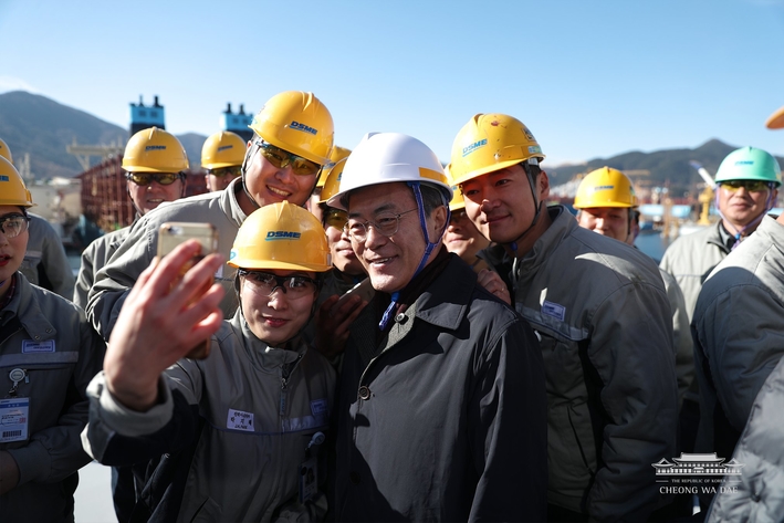 문재인 대통령이 3일 경남 거제 대우조선해양 옥포조선소 쇄빙 LNG선박 건조 현장를 방문해 기념촬영을 하고 있다.