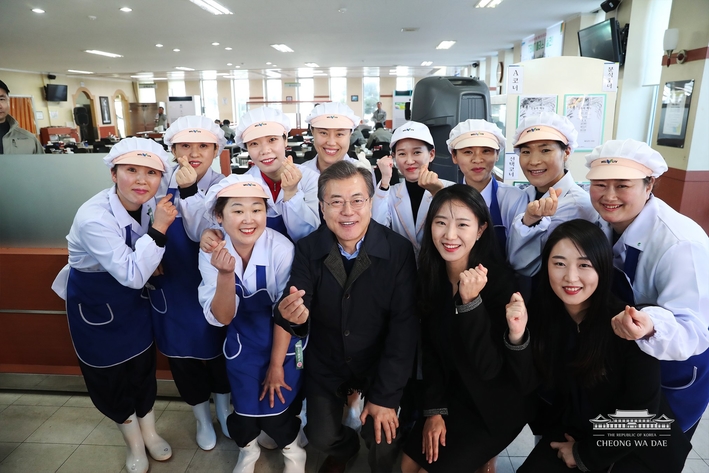 문재인 대통령이 3일 경남 거제 대우조선해양 옥포조선소 쇄빙 LNG선박 건조 현장를 방문해 직원식당 영양사, 조리원들과 기념촬영을 하고 있다.