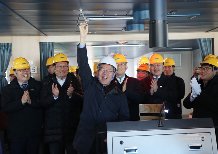 문재인 대통령이 3일 경남 거제 대우조선해양 옥포조선소 쇄빙 LNG선박 건조 현장를 방문했다.
