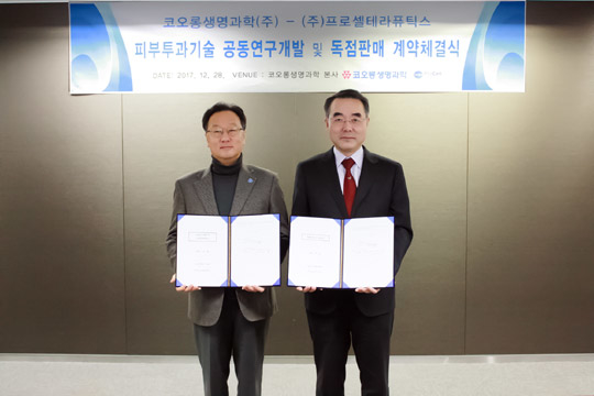 코오롱생명과학(대표이사 이우석)과 프로셀테라퓨틱스(대표이사 이병규)는 화장품 피부투과 기술 관련 공동연구개발 및 독점판매 계약을 체결했다고 지난 3일 밝혔다.