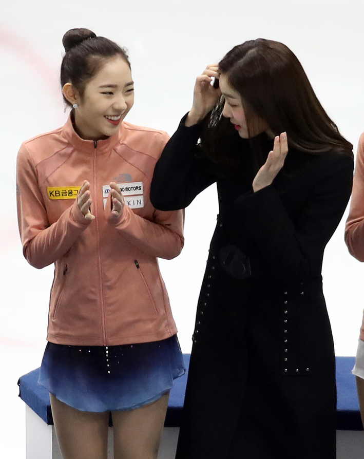 최다빈이 7일 서울 목동아이스링크에서 열린 올림픽 최종 선발전 'KB금융 코리아피겨스케이팅 챔피언십 2018'. 에서 피겨스타 김연아와 만나 이야기를 나누고 있다.