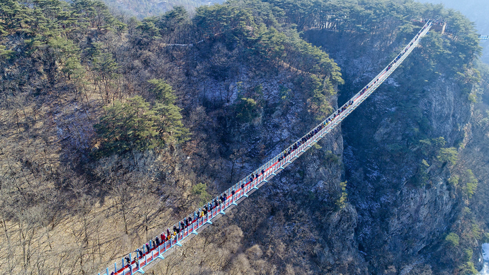 '원주 소금산 출렁다리'가 11일 개통해 시민들이 다리를 건너며 환호하고 있다.