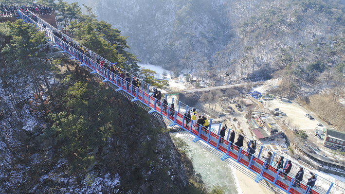 '원주 소금산 출렁다리'가 11일 개통해 시민들이 다리를 건너며 환호하고 있다.