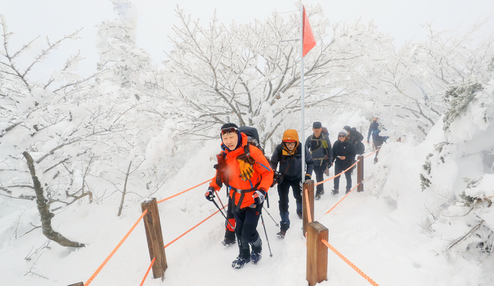 15일 오전 제주 한라산 영실 코스를 찾은 등반객들이 눈꽃이 활짝 핀 탐방로를 걷고 있다.