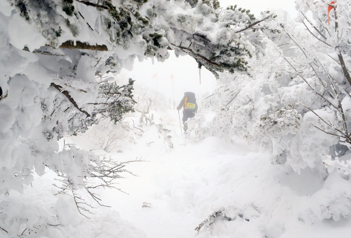 15일 오전 제주 한라산 영실 코스를 찾은 등반객들이 눈꽃이 활짝 핀 탐방로를 걷고 있다.
