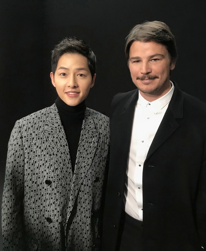 배우 송중기가 21일(한국시간) 프랑스 파리에서 열린 '디올 옴프 파리 콜렉션'에서 조쉬 하트넷과 포즈를 취하고 있다.