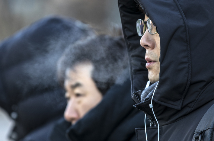 최저기온 영하 17도를 기록한 24일 오전 서울 세종로사거리에서 시민들이 추위에 떨며 신호를 기다리고 있다.
