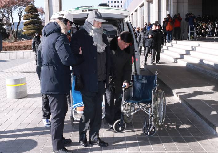 국가정보원에서 억대 뒷돈을 수수한 혐의를 받고 있는 이상득 전 새누리당 의원이 26일 오전 서울 서초동 중앙지검에 피의자 신분으로 소환돼 휠체어를 탄 채 법원 청사 안으로 들어가고 있다.