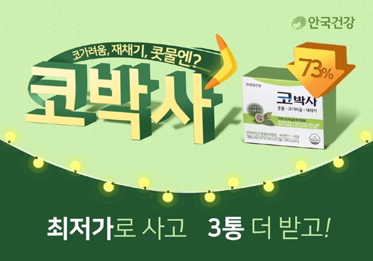 이번 행사를 통해 안국건강의 코 건강기능식품 ‘코박사’ 3박스로 구성된 ‘코박사 부메랑 패키지’를 73%의 파격적인 할인 혜택으로 만나볼 수 있다. 미세먼지와 한파로 악화된 코 질환으로 고생하는 이들에게 좋은 구매 기회를 제공할 것으로 보인다. 또한 ‘코박사 부메랑 패키지’를 구입하고 3개월 간 섭취한 후 간단한 설문조사에 참여하면 추후 동일 제품이 추가 증정된다