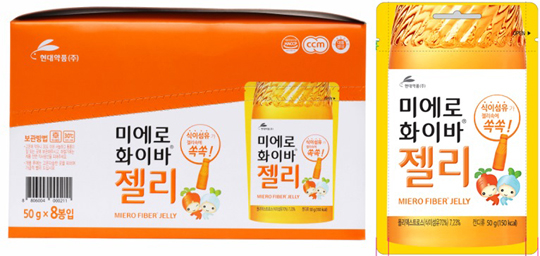 현대약품은 ‘건강간식’으로 젤리를 선호하는 20~30대 소비자들을 공략하기 위해 미에로화이바 젤리를 새롭게 선보였다. 미에로화이바의 병 모양을 재현한 이 젤리는 음료의 산뜻한 맛에 살짝 가미된 단맛과 젤리 특유의 말랑말랑한 식감으로 색다른 미에로화이바를 보여주는 제품이다. 한 봉지 용량은 총 50g이며, 식이섬유는 2.5g 함유됐다. 제품 패키지는 한 상자에 8봉지로 구성됐다.