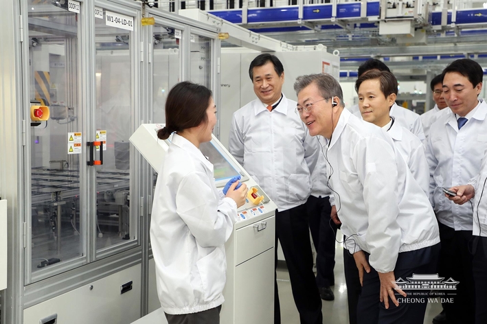 문재인 대통령이 1일 충북 진천 한화큐셀 진천공장을 방문해 일자리나누기 공동선언식을 마친 후 생산라인 시찰을 하고 있다.