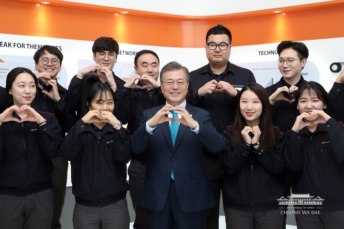 문재인 대통령이 1일 충북 진천 한화큐셀 진천공장을 방문해 일자리나누기 공동선언식을 마친 후 포즈를 취하고 있다.